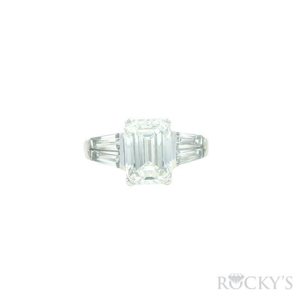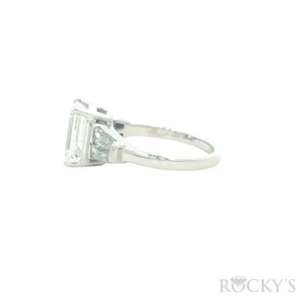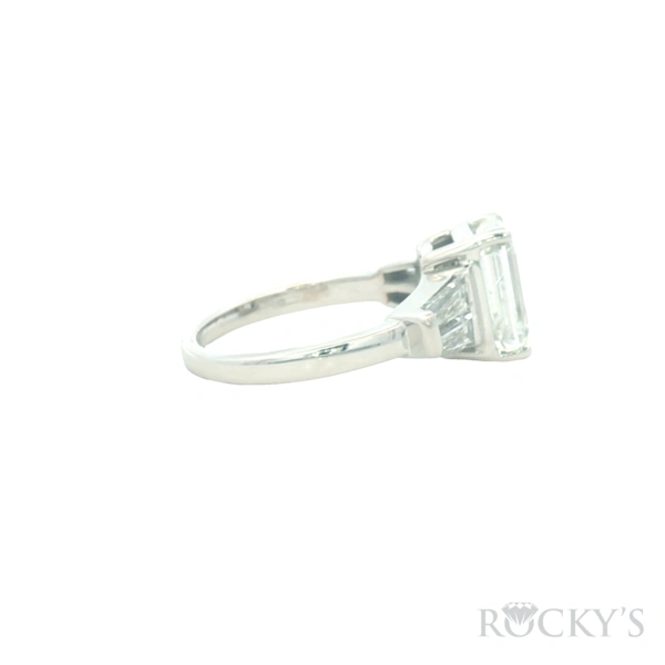 14 Karat White Gold Lab Grown Engagement Ring, Size 6.5 With Lab Grown Center Diamond 3.04Ct Emerald Cut E Color & VS2 Clarity Cert#LG732565766 and 2 side diamonds of 1.00ctw tapered baguette shape Color E & VS1 Clarity Lab Diamonds
