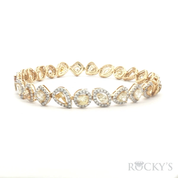 18 Karat 2Tone Gold Color Diamond Bracelet With 25 / 5.173ctw Mix Shapes(Round, Pear, Princess, Heart and Marquise cut) Yellow and Brown color Fancy Diamonds And 395/1.481Tw Round G/H Color & SI Clarity white Diamonds