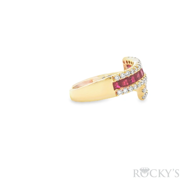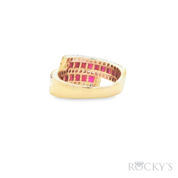 14 Karat Yellow Gold Ruby Ring With 2.09Twt Princess Cut Red Rubies And 0.59Twt Round Cut G/H Color & SI Clarity Diamonds