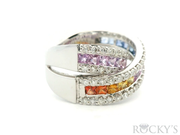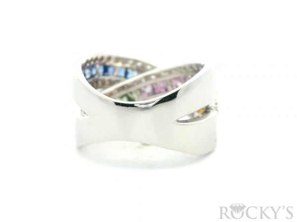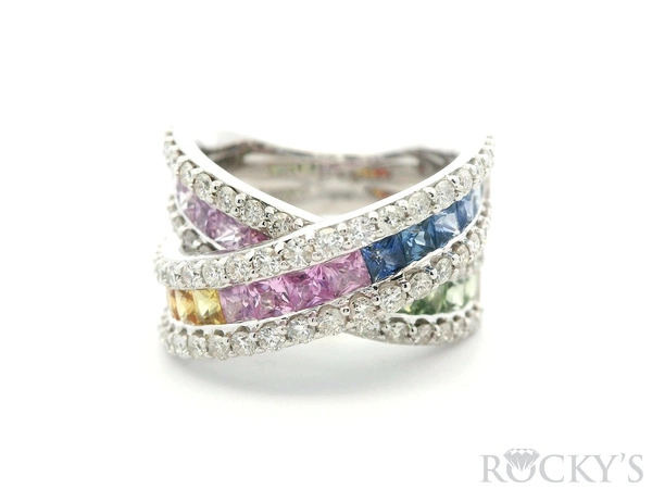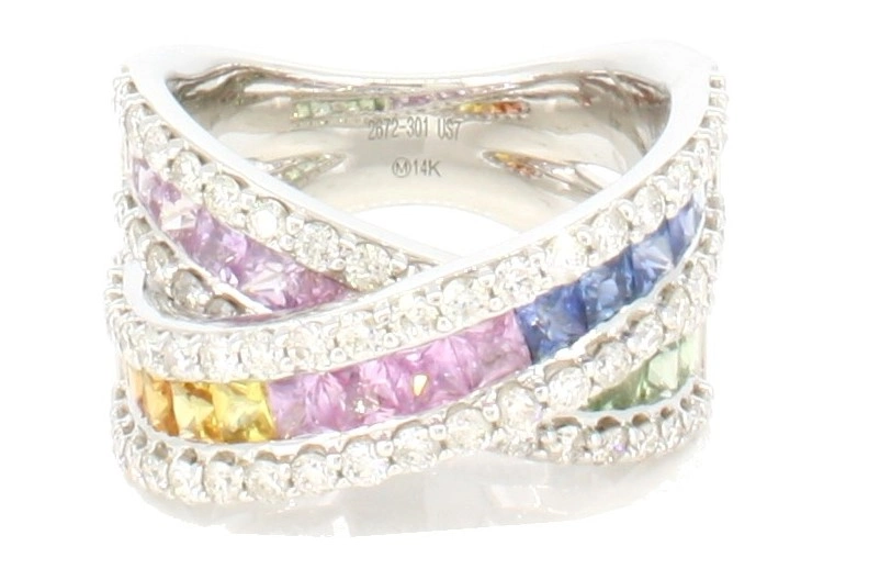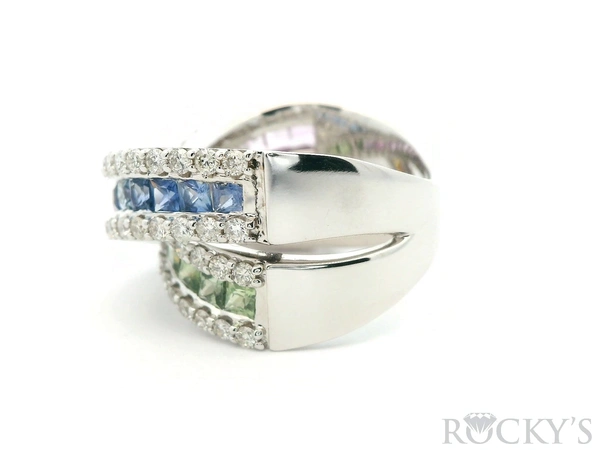 14 Karat White Gold Multi Sapphire Ring, Size 7, With 2.80Twt Princess Cut Multi Color Sapphires And 1.42Twt Round Cut G/H Color & SI Clarity Diamonds
