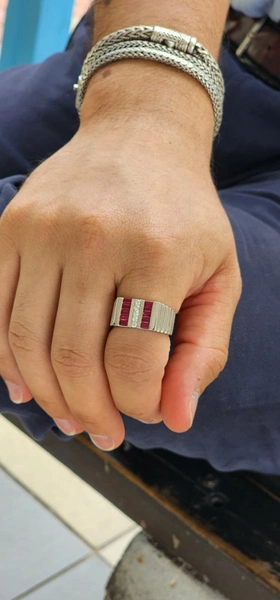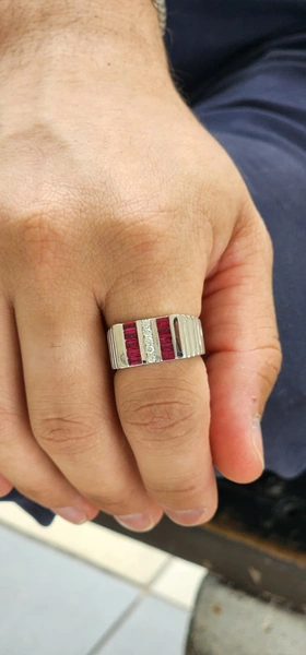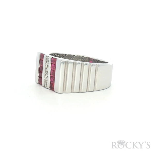 White 14k Mens Ring with 1.44Tw Baguette Ruby and 0.17Tw Round Shape Diamond