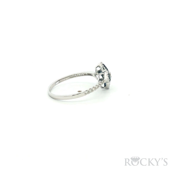 18 Karat White Gold Color stone Sapphire Ring With 4/0.884ctw Pear shape Blue Sapphires And 15/0.121ctw Round G/H Color & SI Clarity white Diamonds, Ring size 7