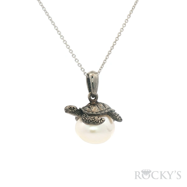 925 Sterling Silver Freshwater White Pearl Turtle over an egg Necklace with 12mm freshwater white pearl, Chain 18", 4.85 grms