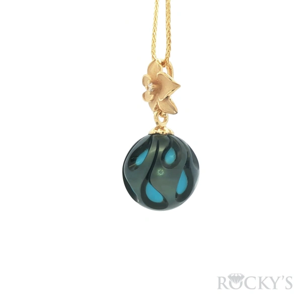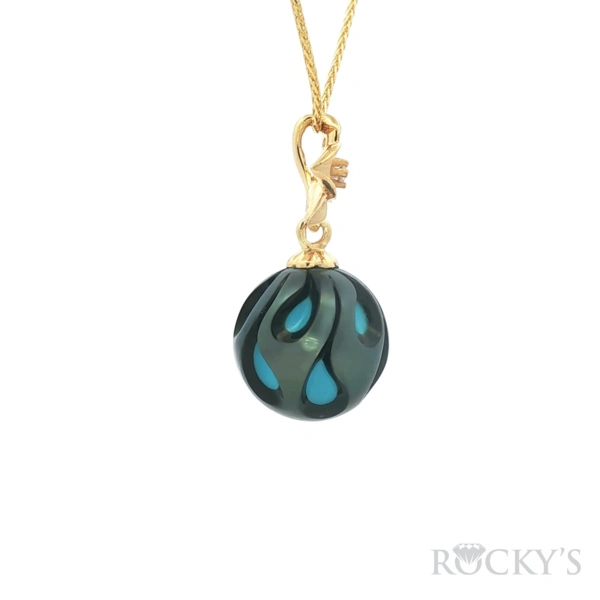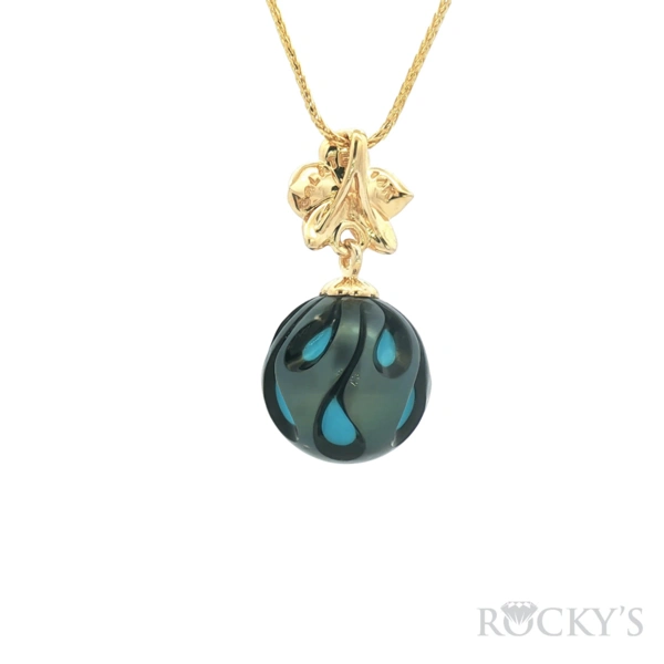 14kt Yellow Gold, Limited Edition Galatea Pearl Collection w/Dia 0.05mm round & 15mm Hand-carved Tahitian Galatea Pearl Pendant, Galatea Pearl Interior: Blue Turquoise with 18inches 14Kt yellow Gold Wheat Chain