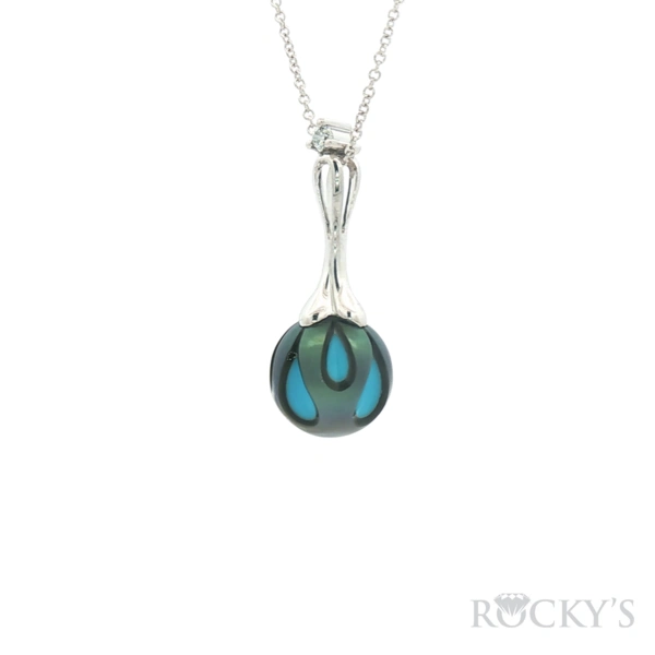 14kt White Gold, Galatea Pearl Collection w/Dia 0.03ct round & 9.00mm Hand-carved Tahitian Galatea Pearl Pendant, Galatea Pearl Interior: Blue Turquoise with 18inches 14Kt White Gold Rolo Chain