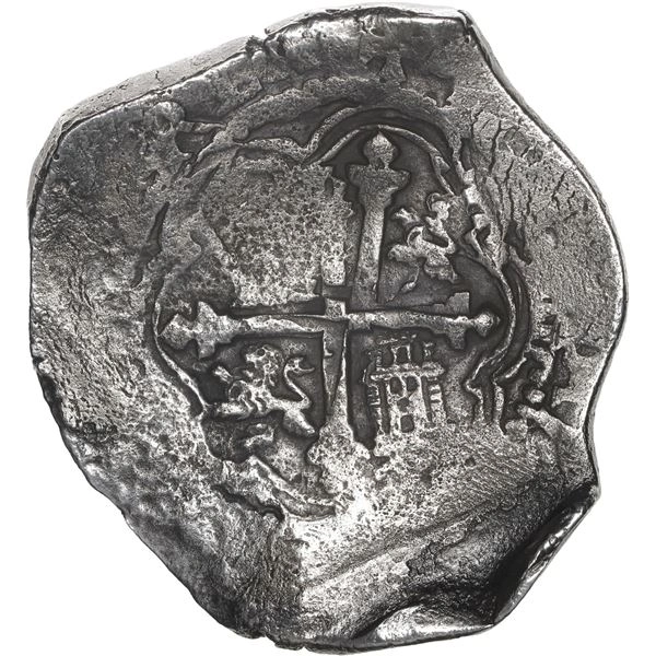 MEXICO, Mexico City, cob 8 reales, Philip IV, assayer not visible (P). S-M19; KM-45; Cal-Type 319. 25.43 grams. Large flan with partially crude edge due to uneven thickness, good full shield, doubled full cross, nicely toned, some light surface corrosion.