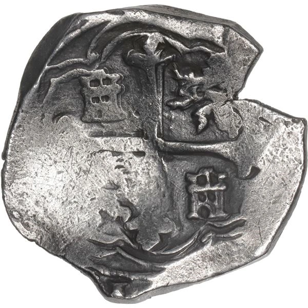 MEXICO, Mexico City, cob 4 reales, Philip IV, assayer not visible (D). S-M18a; KM-38; Cal-Type 275. 13.03 grams. Roundish flan (unevenly thick) with large natural edge-crack, nice but partially flat full cross and shield, nicely toned, practically corrosi