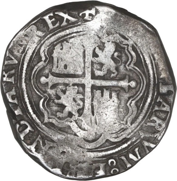 MEXICO, Mexico City, cob 4 reales, Philip II, assayer O below mintmark oM to right, denomination o-IIIJ to left, ex-Hubbard. S-M11; KM-36; Cal-506. 13.53 grams. Broad-flan AVF with some bold legend (figure-8 ornaments), full denomination o-IIIJ [sic] and