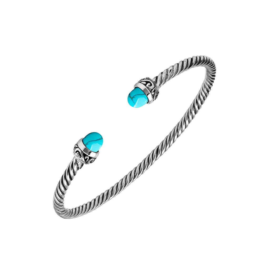 This Sterling Silver Bangle features a beautifully twisted cable design accented with vibrant turquoise shell caps on each end. The ends are framed by hand-carved Balinese patterns with subtle oxidized detailing, creating a refined contrast of texture and shine.