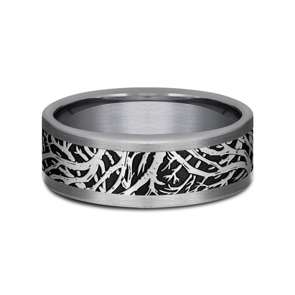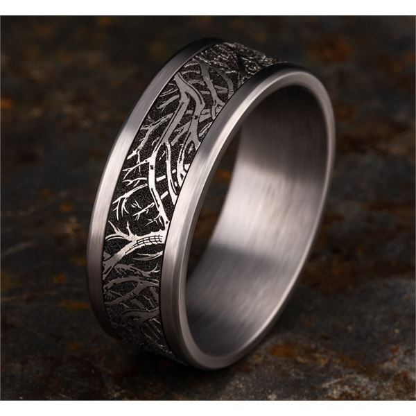 8mm, Comfort fit Grey Tantalum and Grey/Black Titanium Forest branch pattern, straight edges