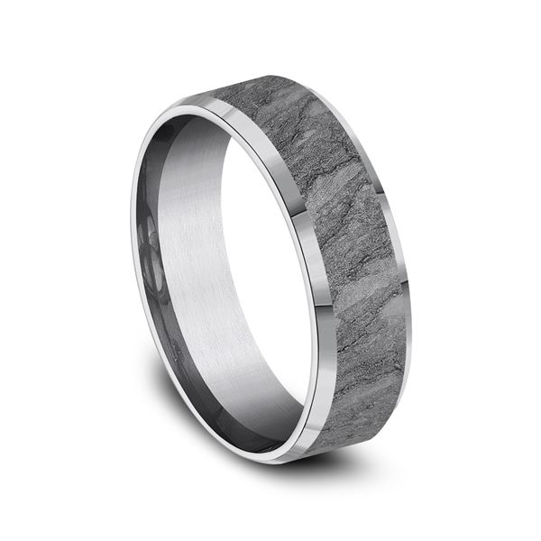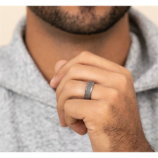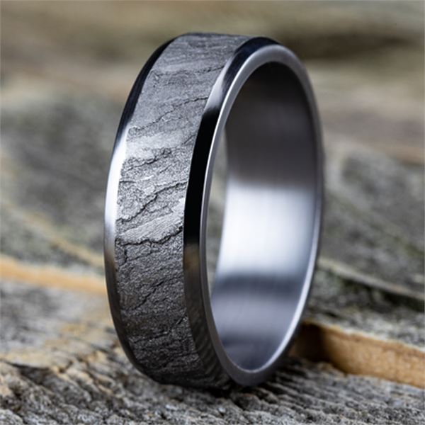 7mm, Comfort fit Grey Tantalum Lava rock textured center, polished slightly beveled edges