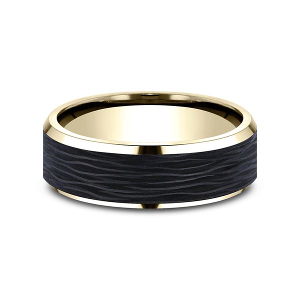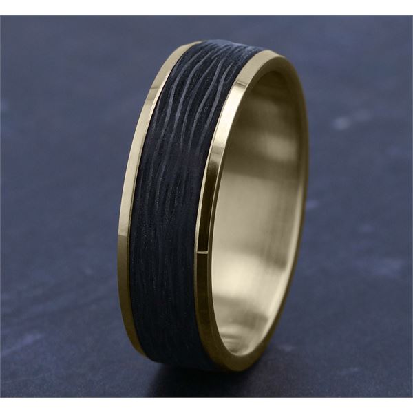 7mm, Comfort fit 14K Yellow Gold and Forged Carbon Fiber Forged carbon fiber center, bevel edges