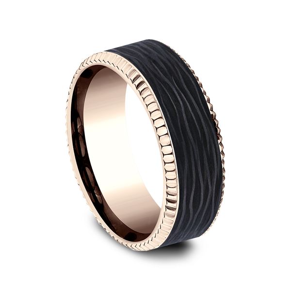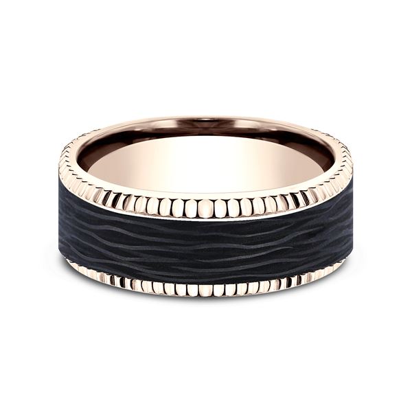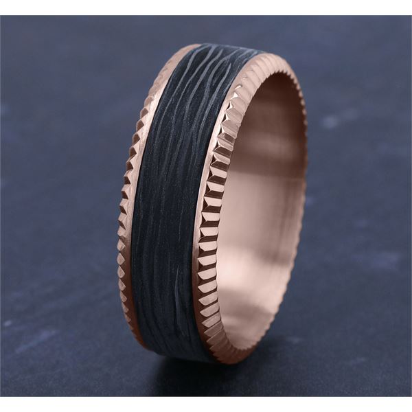 8mm, Comfort fit 14K Rose Gold and Forged Carbon Fiber Forged carbon fiber center, fluted bevel edges