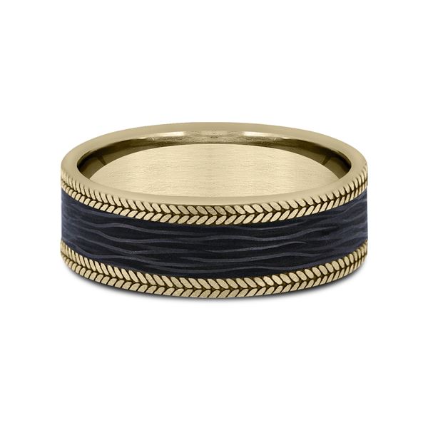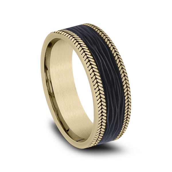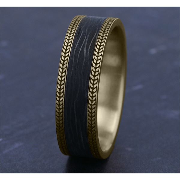7mm, Comfort fit 14K Yellow Gold and Forged Carbon Fiber Forged carbon fiber center, chevron edges
