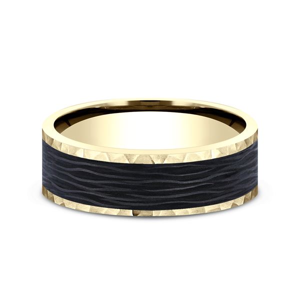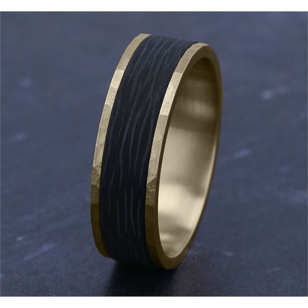 7mm, Comfort fit 14K Yellow Gold and Forged Carbon Fiber Forged carbon fiber center, hammer edges