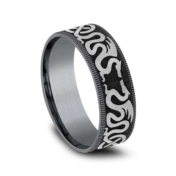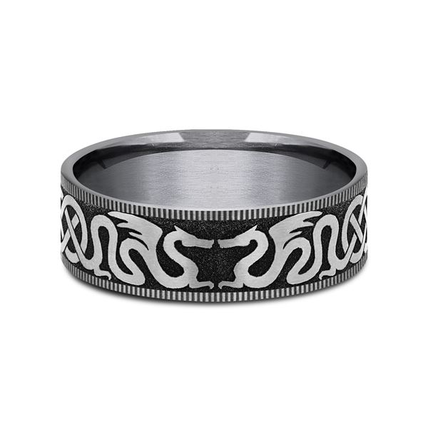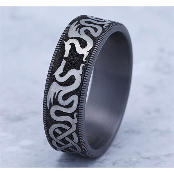7.5mm, Comfort fit Grey Tantalum and Grey/Black Titanium Dragon and celtic knot design, thin edges