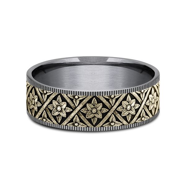 7.5mm, Comfort fit Grey Tantalum and 14K Yellow Gold Floral weave design, thin edges