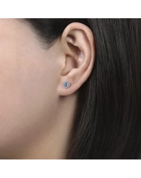 14K White Gold Halo Aquamarine and Diamond Stud Earrings