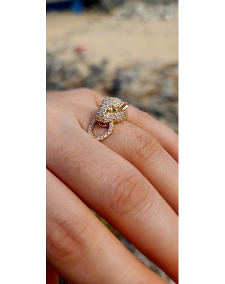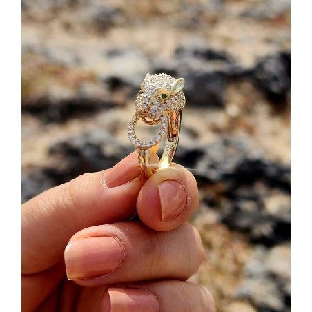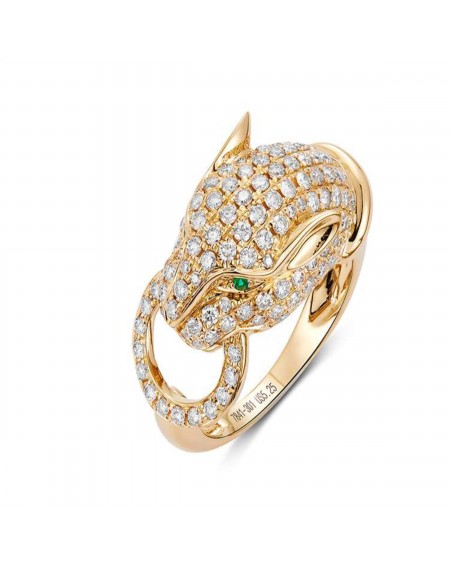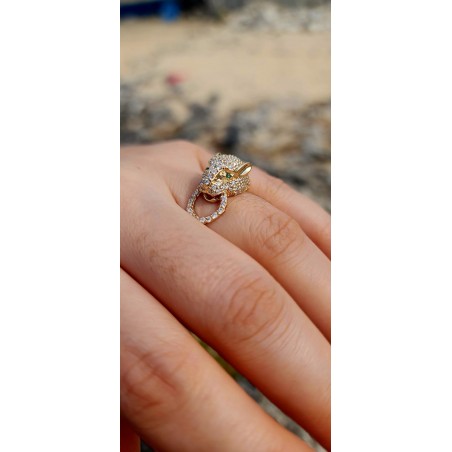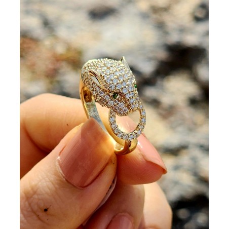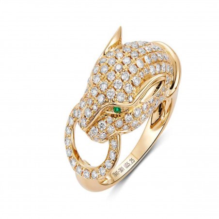 18k Yellow gold panther head ring with diamonds and tsavorite