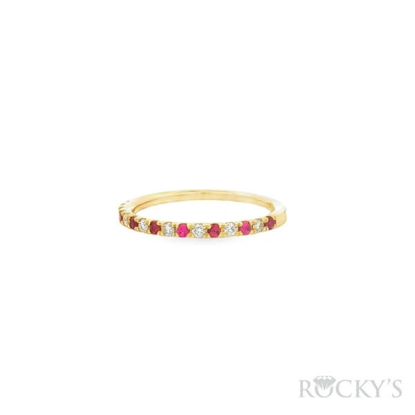 14 Karat Yellow Gold Stackable Ruby Ring, Size 6.25, with 8stn: 0.16TWT Round Cut Red Rubies and 8stn: 0.12TWT Round Cut G/H Color SI Clarity Diamonds