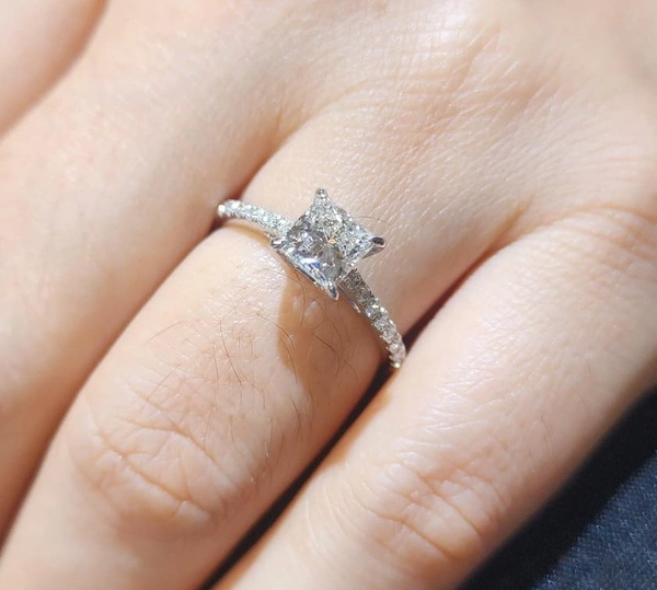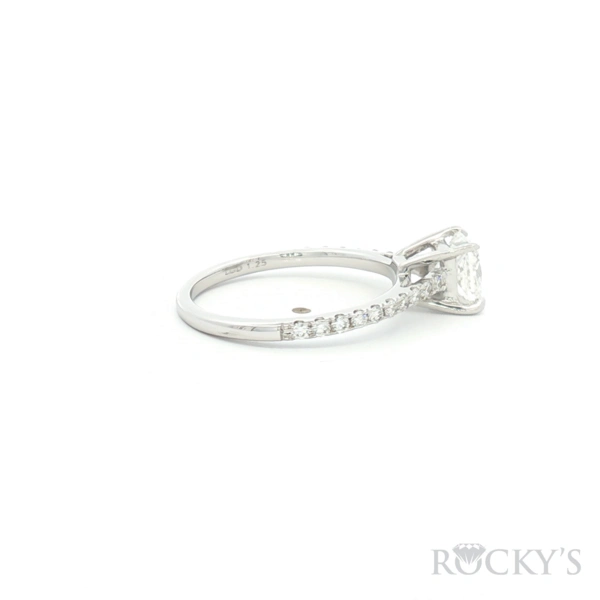 14 Karat White Gold Lab Diamond Solitaire Engagement Ring, with 1.03carat, F / VS Princess Cut center Lab grown diamond and 0.26ctw E-F/ VS Round cut lab diamonds.