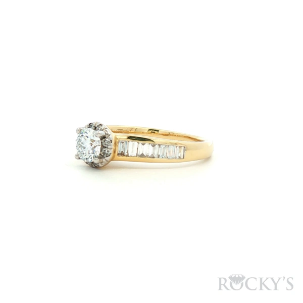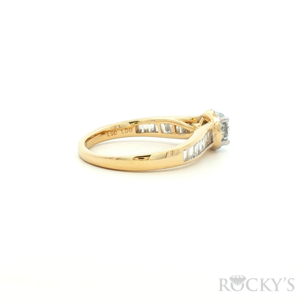 Yellow 14 Karat Lab Grown Diamond Engagement Rings With 0.50Tw Round Diamonds And 0.50Tw Baguette E/F Vs1 Lab Diamonds