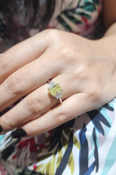 14 Karat White Gold Lab Grown Diamond Engagement Rings Size 7 With 2.37Tw Emerald Yellow VS Lab Diamonds And 0.67Tw Trapezoid E Color & VS Clarity Lab Diamonds