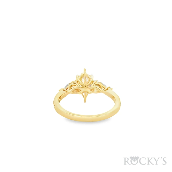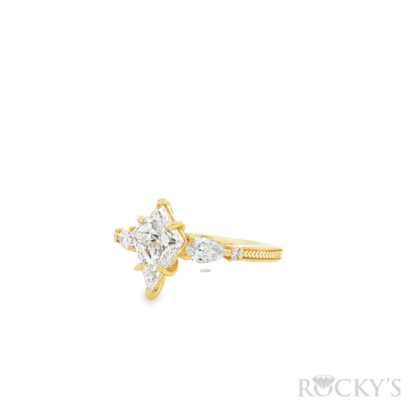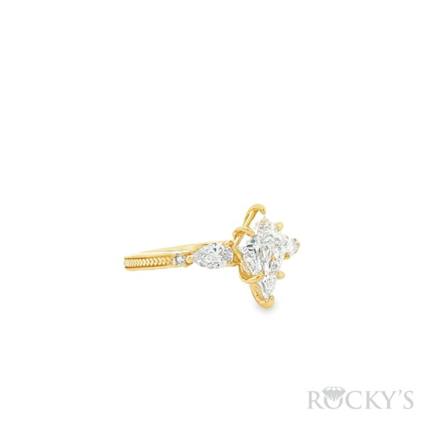 14 Karat Yellow Gold Lab Grown Diamond Engagement Ring, Size 7 with 1: 1.44TWT Kite Step Cut E Color VVS2 Clarity 10.95 X 7.09 X 4.31MM - IGI:LG737547406 Lab Center Diamond, and 0.39TWT Pear shape & Round Shape E/F Color VS Clarity Lab Side Diamonds