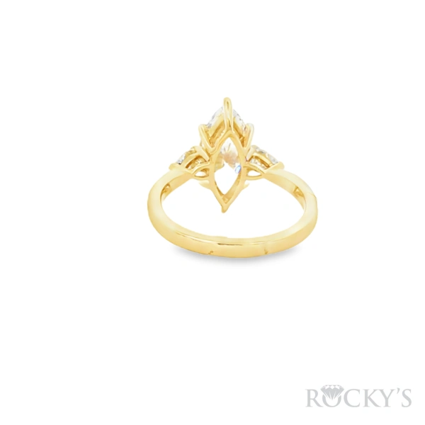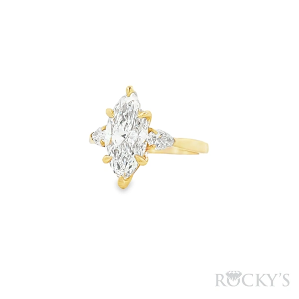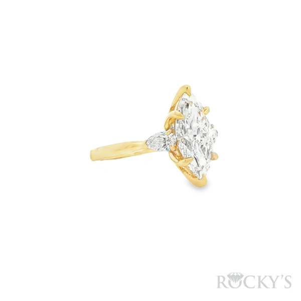 14 Karat Yellow Gold Lab Grown Diamond Engagement Ring, Size 7 with 1: 2.53TWT Marquise Cut D Color VS2 Clarity IGI: LG674502877 Lab Center Diamond, and 0.41TWT Pear shape E/F Color VS Clarity Lab Side Diamonds
