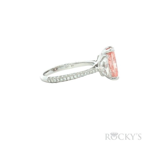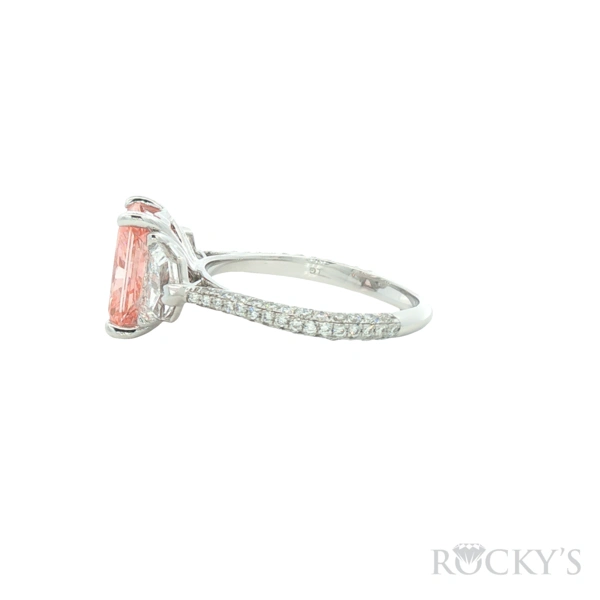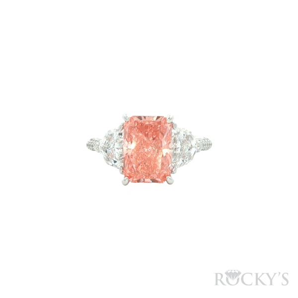14 Karat White Gold Lab Grown Emerald Cut Semi Mount Ring Size 8 With 1.90Tw Mix Shapes E VS1 Lab Diamonds on the side With one 3.13ct Cut Cornered Rectangular Modified Brilliant cut Fancy Vivid Pink VS2 Cert#LG628482259 Lab Grown Loose Diamond in Center.