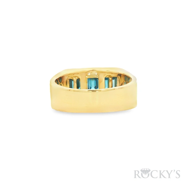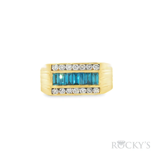 14 Karat Yellow Gold Men's Rings Size 10.5 with 0.66TWT Baguette Cut Blue Diamonds