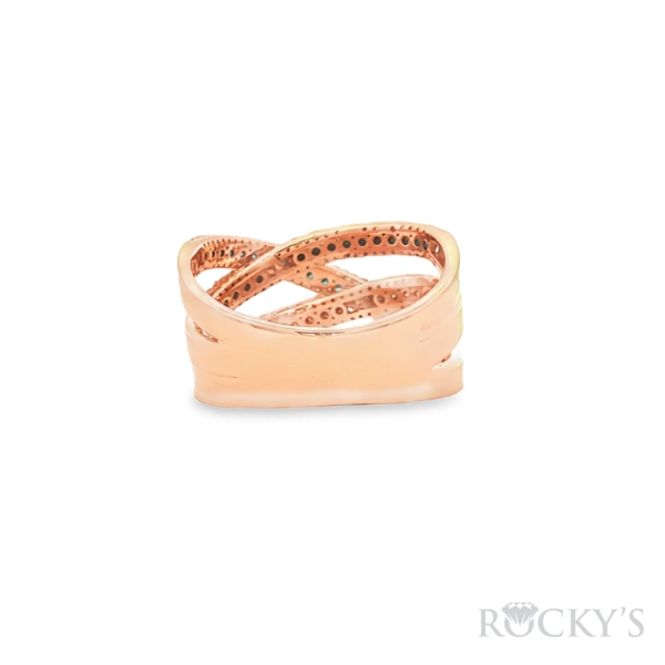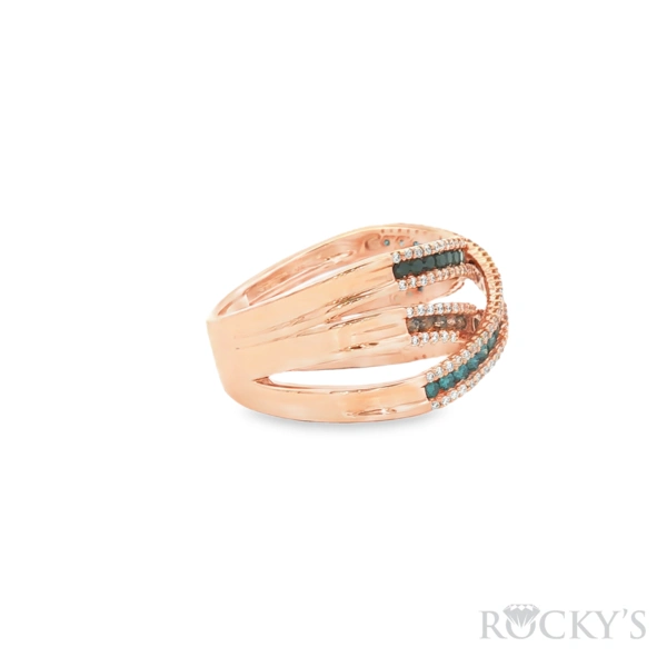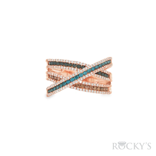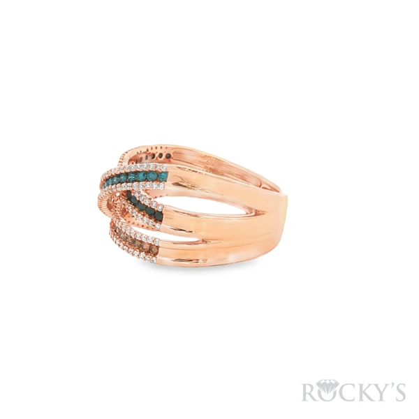 14 Karat Rose Gold Color Diamond Ring Size 7.5 with 0.34TWT Round Cut G/H Color SI Clarity white Diamonds, 0.20TWT Round Cut Blue Diamonds, 0.153TWT Round Cut Brown Diamonds, and 0.10TWT Round Cut Black Diamonds