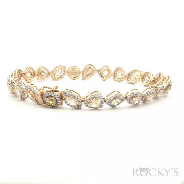 18 Karat 2Tone Gold Color Diamond Bracelet With 25 / 5.173ctw Mix Shapes(Round, Pear, Princess, Heart and Marquise cut) Yellow and Brown color Fancy Diamonds And 395/1.481Tw Round G/H Color & SI Clarity white Diamonds