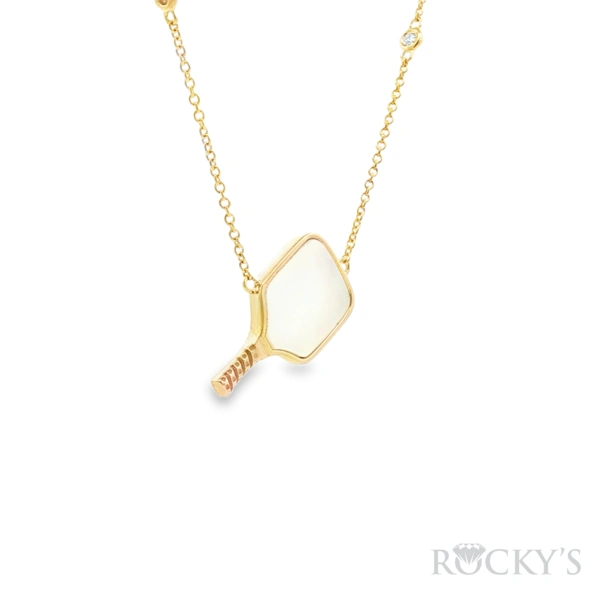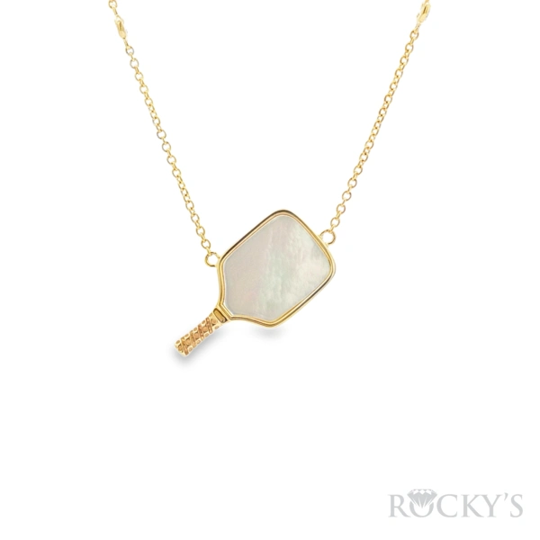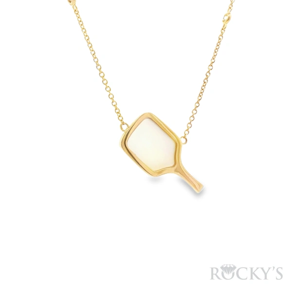 14 Karat Yellow Gold Diamond pickleball paddle Necklace with 0.10TWT Round Cut G/H Color & SI Clarity Diamonds and 1.83TWT Paddle Shapes White Mother Of Pearl Necklace (18" Chain Included)