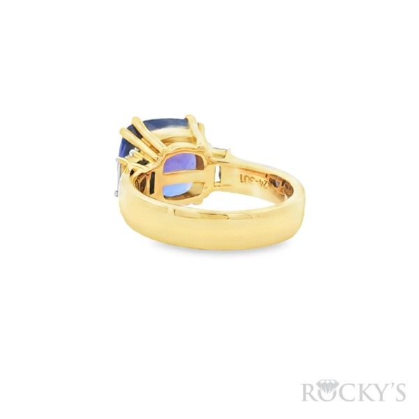 Yellow 14K Tanzanite Ring With One 7.59Ct Cushion Cut Tanzanite And 0.49Ct Baguette cut GH SI Diamonds