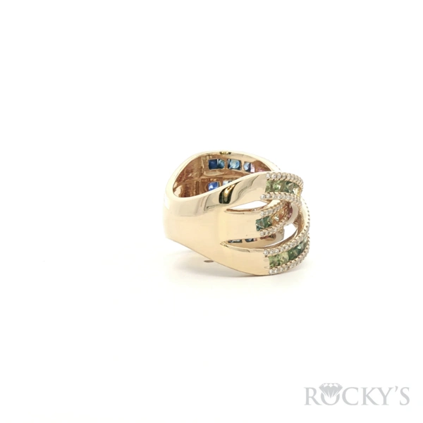 Yellow 14k Multi Sapphire Ring with 4.50Tw Princess Cut Multi Color Sapphire and 1.00Tw Round Shape Diamond, 11 gramss of Gold