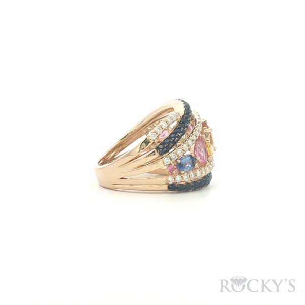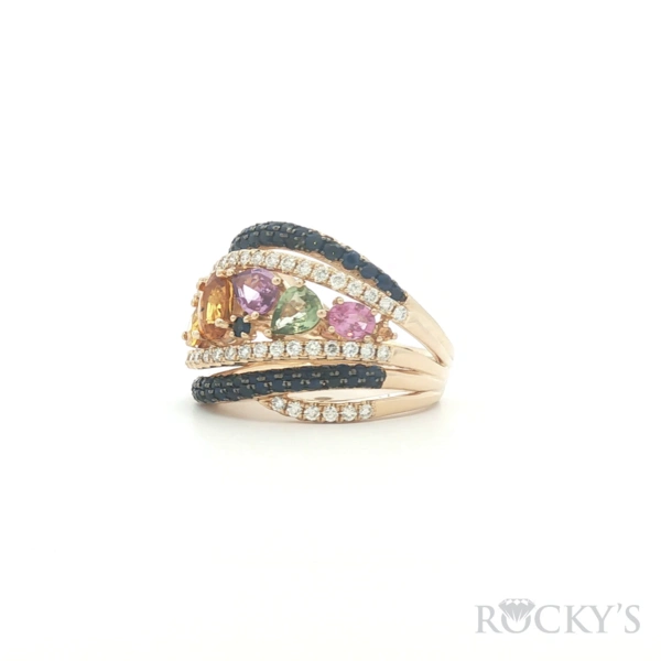 Yellow 14 Karat Color Stone Ring Size 7 With 0.57Tw Round I Color, Si Clarity Diamonds, 2.29Tw Mix Shapes of Multi-Color Sapphires And 1 Twt Round Sapphires