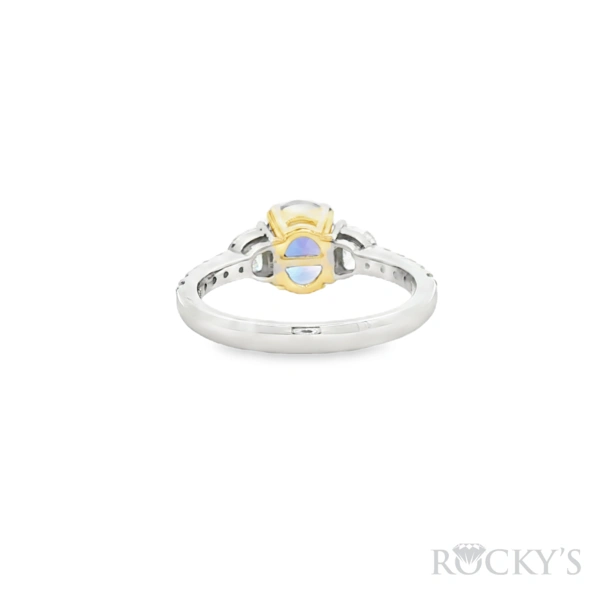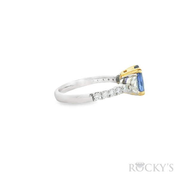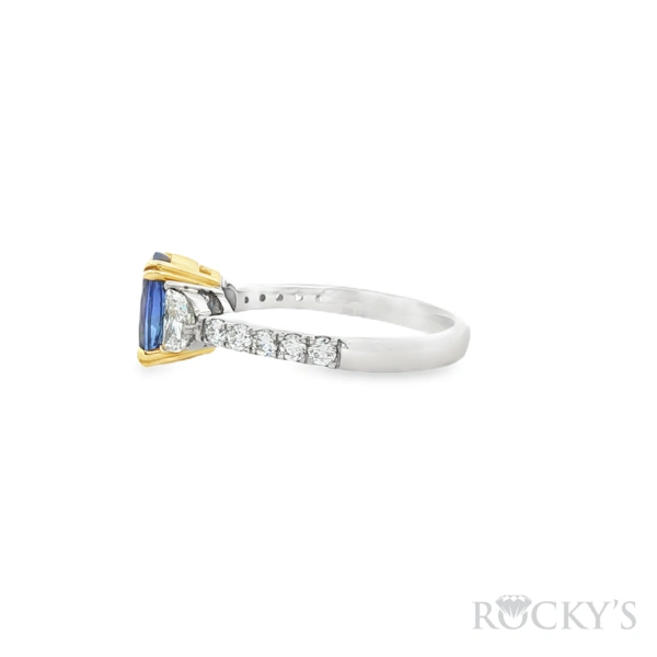 Platinum & 14kt Gold Tanzanite Ring, Size 7.5 with 2.081TWT Oval Cut Tanzanite, 0.51TWT Moon Cut G/H Color SI Clarity Diamonds and 0.14TWT Round Cut G/H Color SI Clarity Diamonds