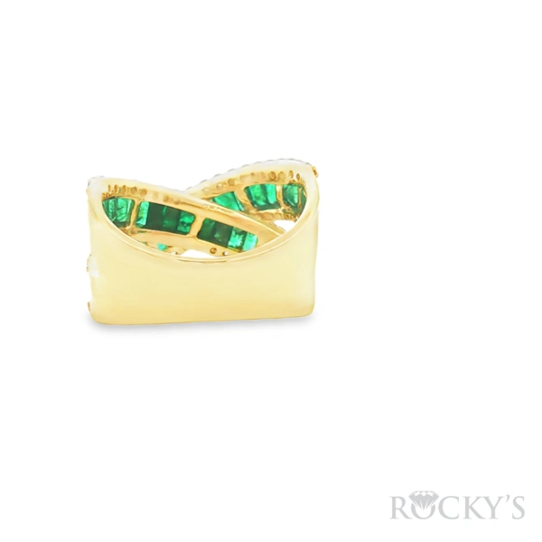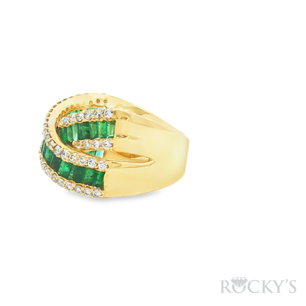 14 Karat yellow Gold Emerald Ring Size 7.5 with 2.10TWT Baguette Cut Emeralds and 1.00TWT Round Cut G/H Color SI Clarity Diamonds