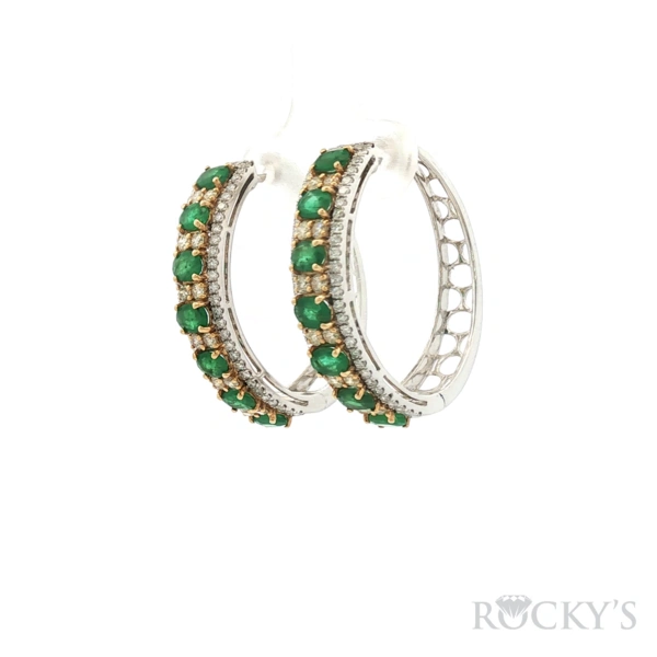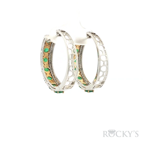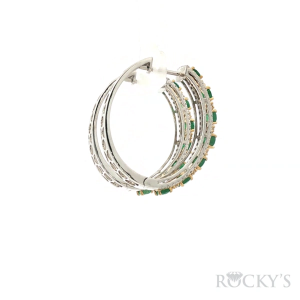 18 Karat 2tone Gold Color Stone Emerald Hoop Earrings With 14 / 2.264ctw Oval Green Emeralds And 144/1.324ctw Round G/H color & SI clarity white Diamonds