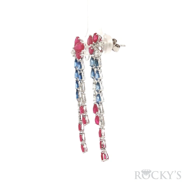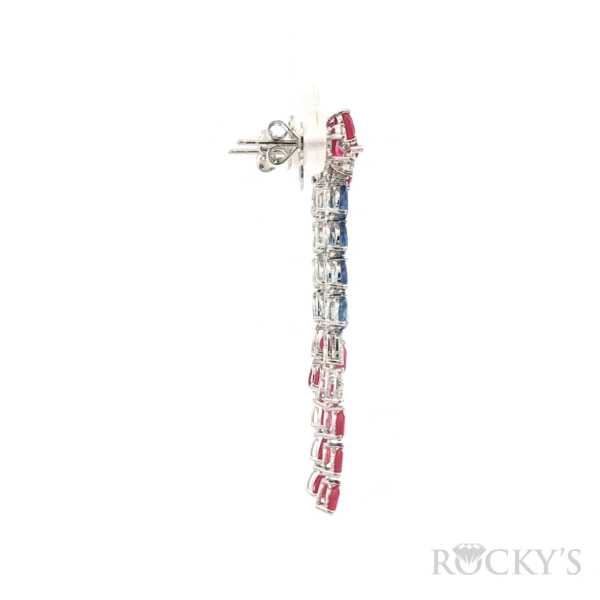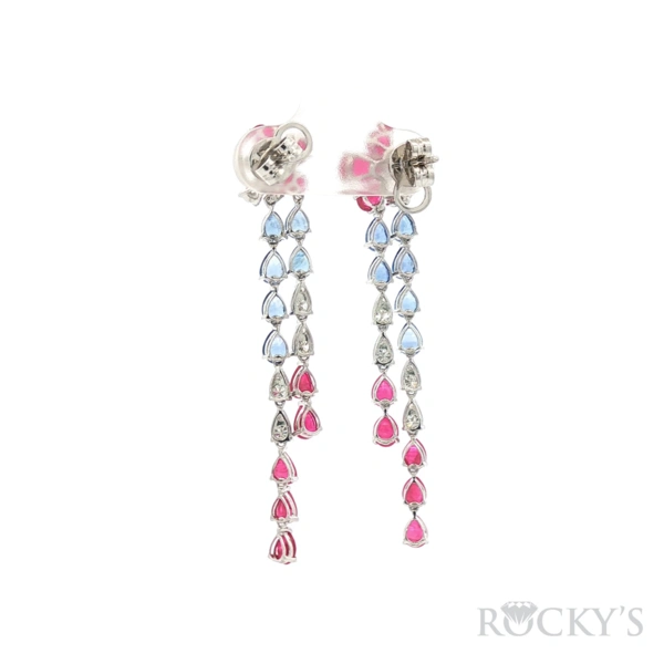 18 Karat White Gold Color Stone Ruby, Sapphire & Diamond Dangling Earrings With 16/3.465ctw Pear shape Red Rubies, 12/2.168ctw Pear shape Blue Sapphires And 0.811ctw G/H Color & SI Clarity Round shape White Diamonds