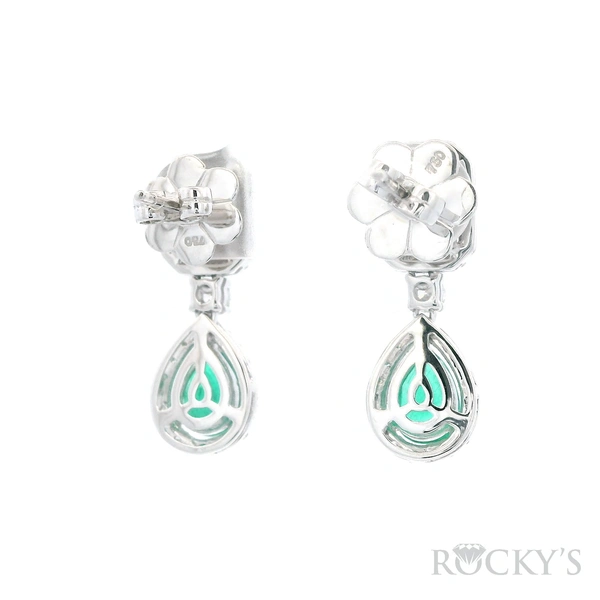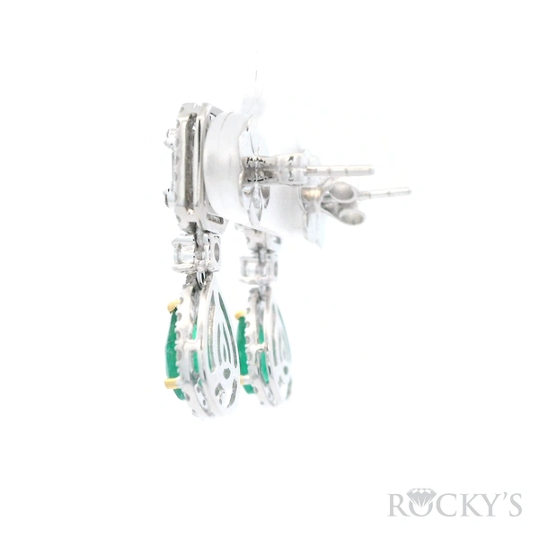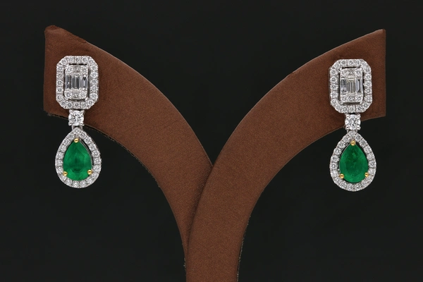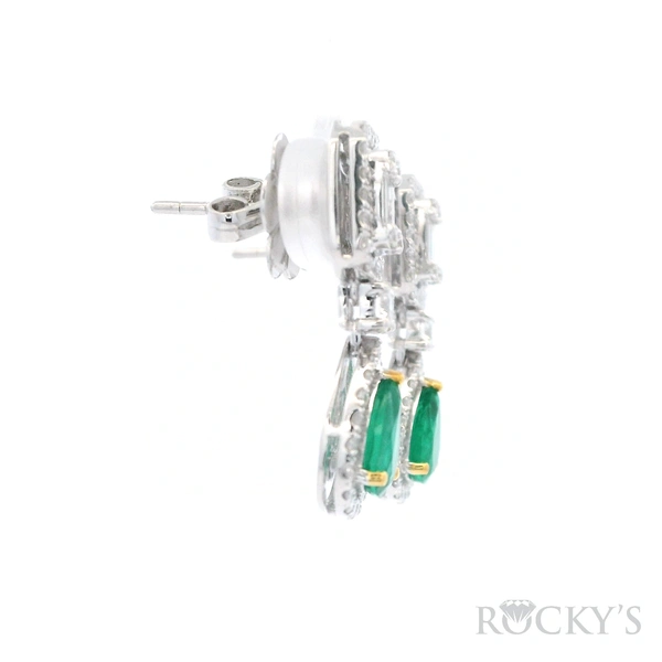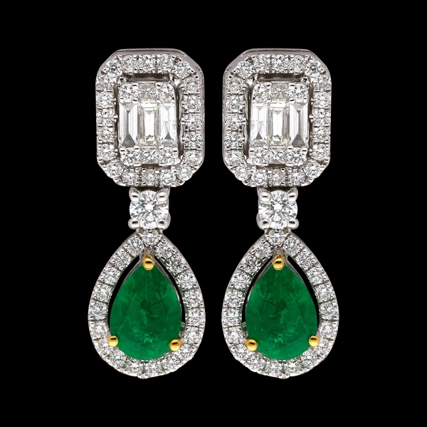 18 Karat White Gold Emerald Earrings With 2/1.32Tw Pear shape Green Emeralds And 98/1.17Tw Mix Shapes G/H Color & SI Clarity Diamonds. (G Wt. : 5.59 gm)