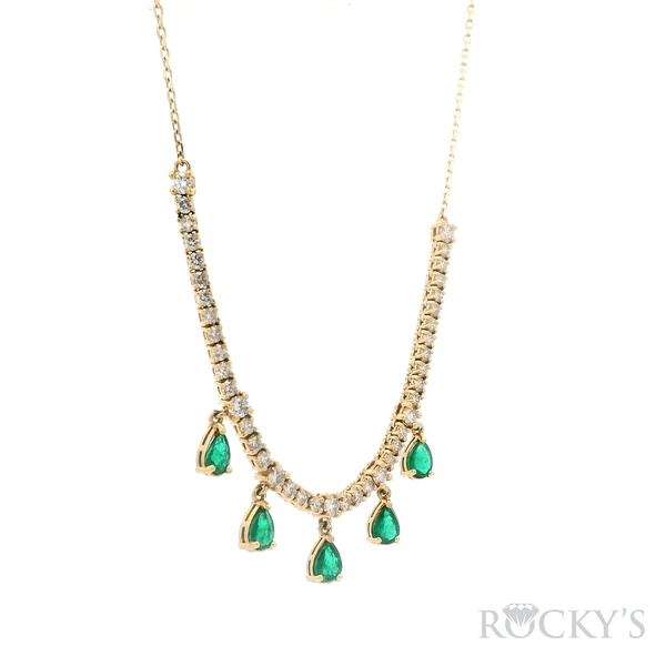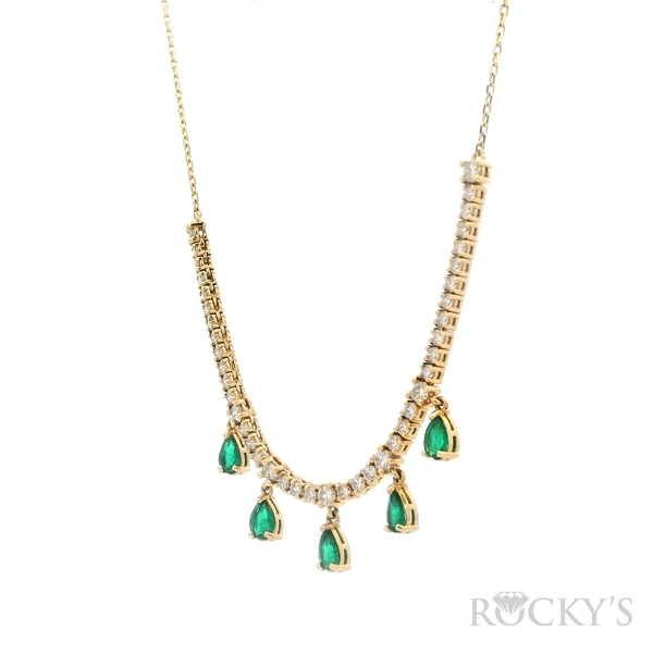 Yellow 14k Emerald Necklace with 1.64Tw Round Shape Diamond and 1.34Tw Pear Shape Emerald