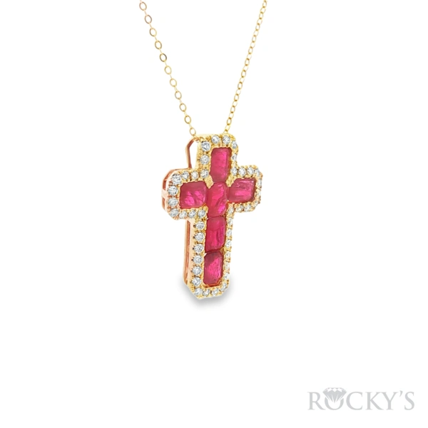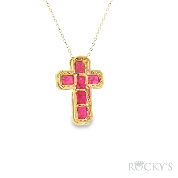 14 Karat Yellow Gold Ruby Cross Pendant Necklace with 2.92TWT Emerald Cut Red Rubies