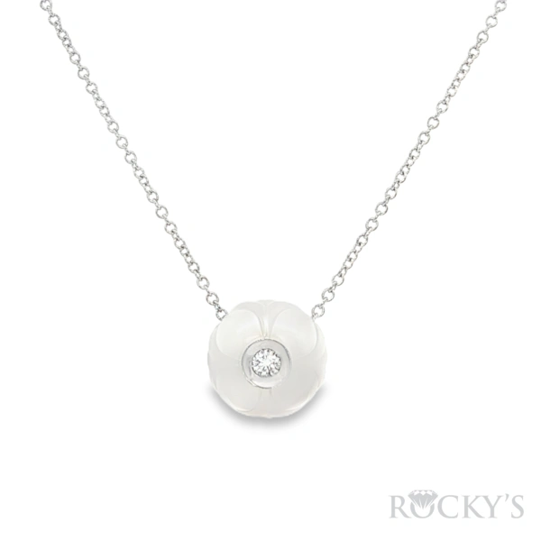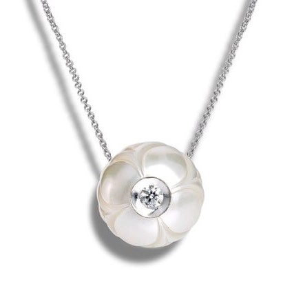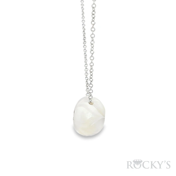 14 Karat White Gold Galatea Jewelry Collection Tulip Pendant, 10mm Fresh Water White Pearl with 0.04CT Round Cut G/H Color SI Clarity Diamond.