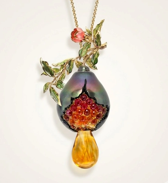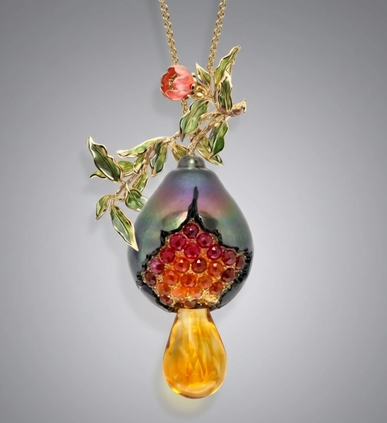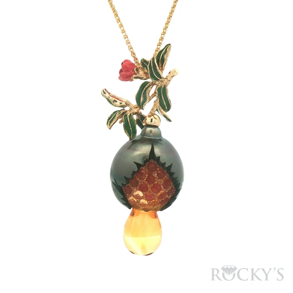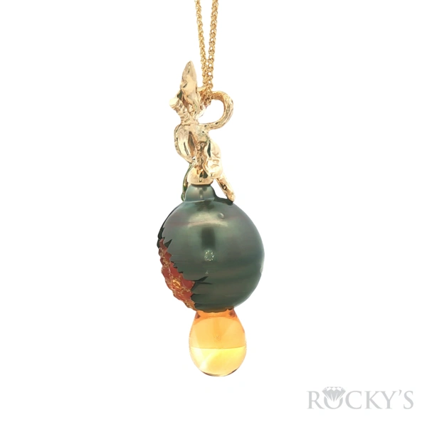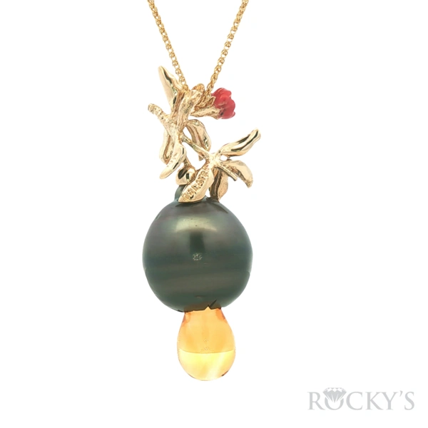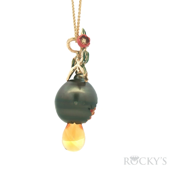 14 Karat Yellow Gold Galatea Jewelry Collection Drop of Nectar Pendant, 15mm Tahitian Black Pearl and Citrine drop, pink tourmaline, ruby and citrine seeds (Chain Length 18 inches Wheat Link)