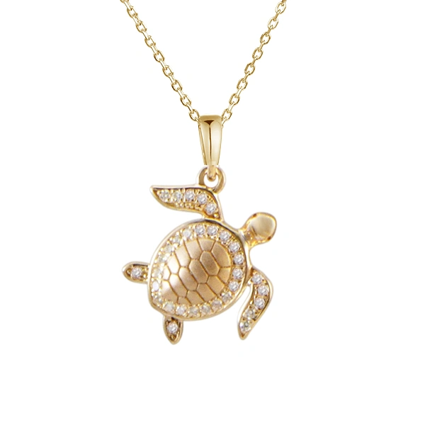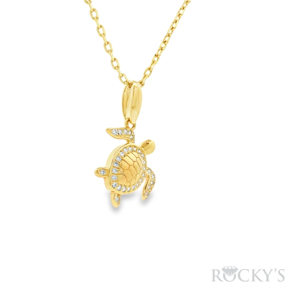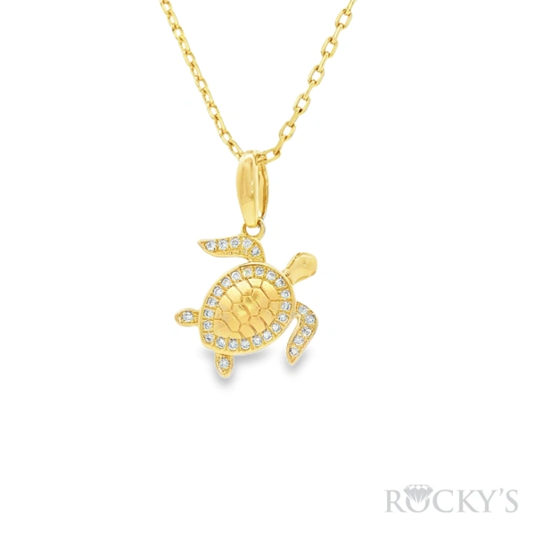 14 Karat Yellow Gold Turtle Pendant, Set with 32 Diamond totaling 0.15 ct SI Clarity & G/H Color.