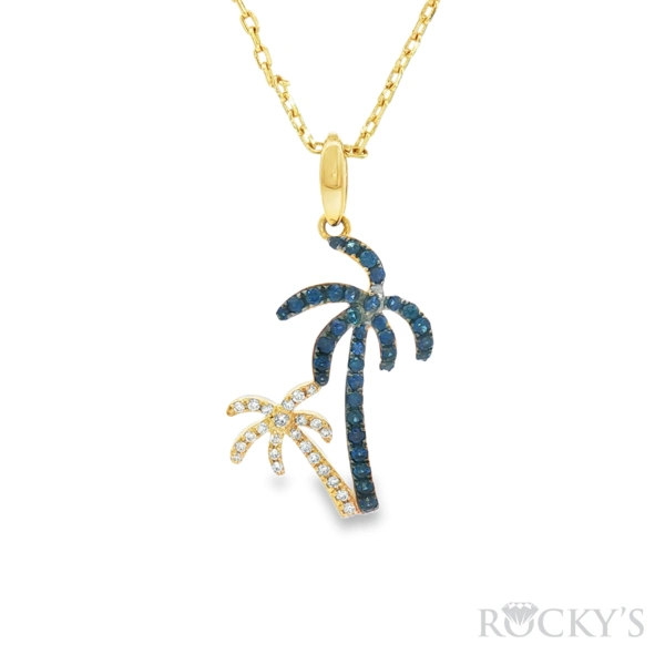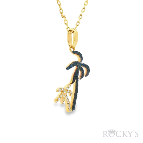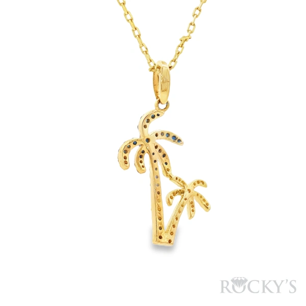 14 Karat Yellow Gold Dia/Sap Palm Tree Pendant (S) Pendant, Set with 35 Dark Blue Sapphires totaling 0.39 ct and 24 Diamond totaling 0.14 ct SI Clarity & G/H Color.