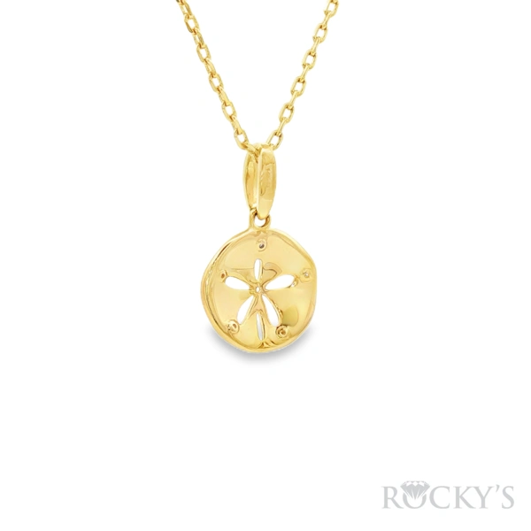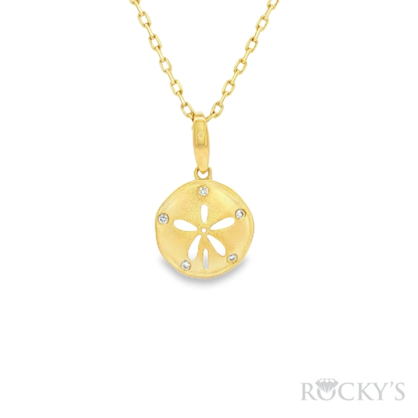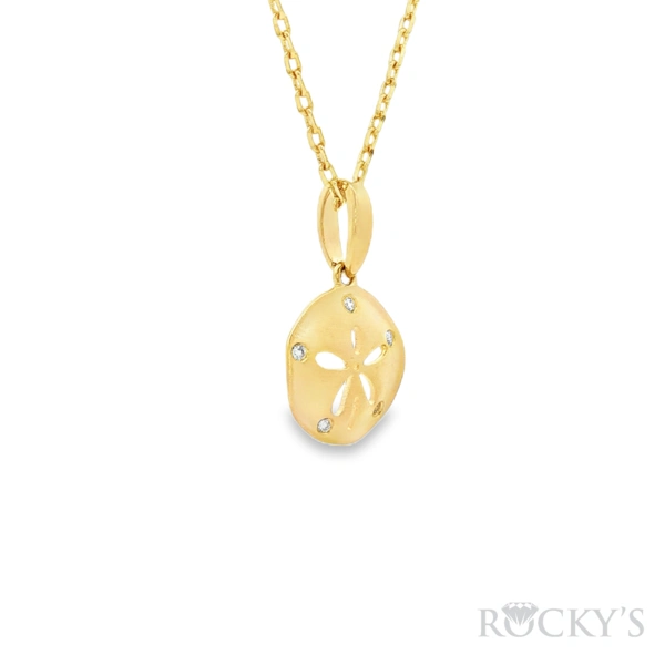 14 Karat Yellow Gold Sand Dollar Pendant, Set with 5 Diamond totaling 0.04 ct SI Clarity & G/H Color.
